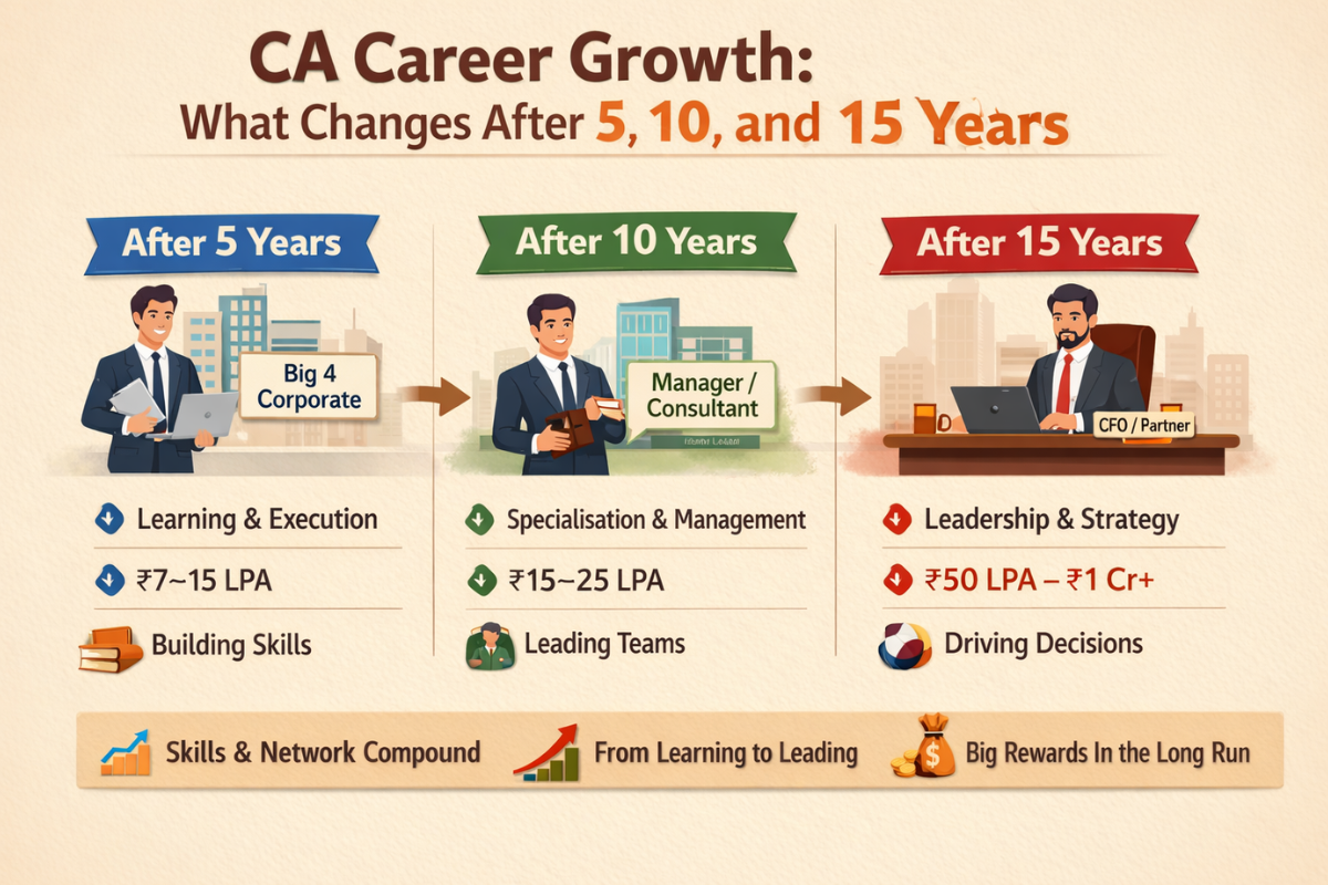 Becoming a Chartered Accountant is a huge achievement, but many students do not realise that the real journey begins after clearing the CA exams. Your career after qualification is like building a house. The foundation you lay in the first few years decides how tall and strong your professional growth will be in the next 10 to 15 years. Understanding how a CA career evolves can help you plan better and avoid common mistakes that stall growth.