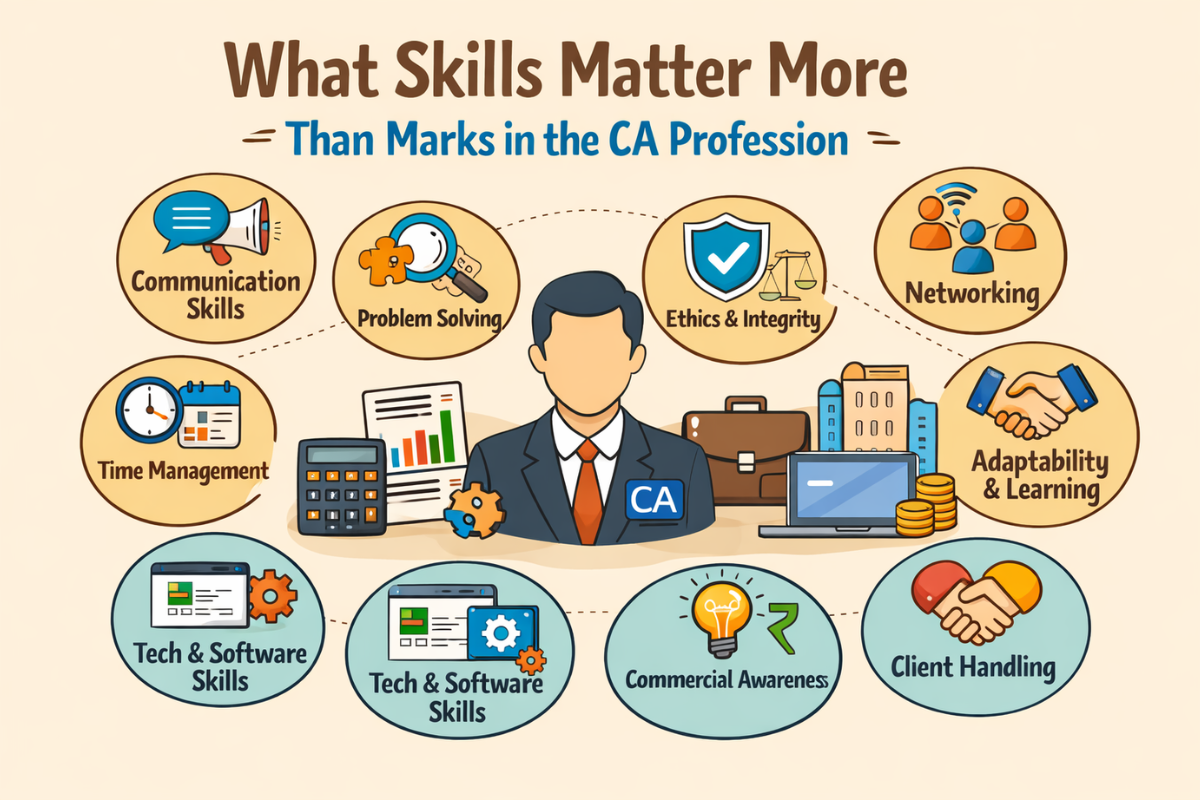 In the real CA profession, skills matter more than marks. Once you step out of the exam hall and enter articleship, job interviews, client meetings, or your own practice, people rarely ask about your rank. They look at how you think, how you communicate, and how you solve problems.
