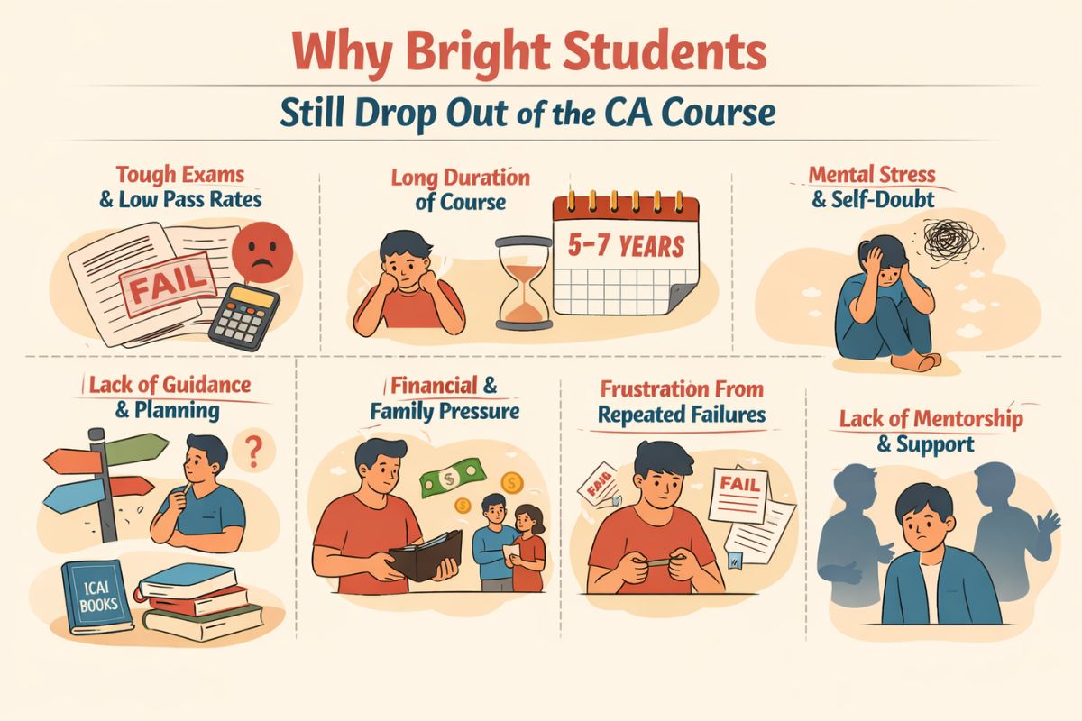 Every year, thousands of intelligent, hardworking, and sincere students enter the Chartered Accountancy (CA) course with big dreams. Many of them are school toppers, strong in maths, commerce, and accounts. Yet, a significant number of these bright students quietly drop out midway.